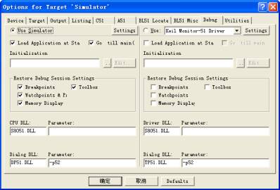 从图2.11可以看出,uVision3的2种工作模式分别是:Use Simulation(软件模拟)和Use(硬件仿真)。其中UseSimlator选项是将uVision3调试器设置成软件模拟仿真模式,在此模式下,不需要实际的目标硬件就可以模拟80C51微控制器的很多功能,在准备硬件之前就可以测试您的应用程序,这样是很有用的。Use选项是高级GDI驱动,运用此功能高级用可以把Keil C51嵌入到自己的系统中,从而实现在目标硬件上调试程序。选择软件模拟仿真,即在图2.11中Debug栏内选中Use Simulator选项,点击“确定”命令按钮加以确认,此时uVision3调试器即配置软件仿真。