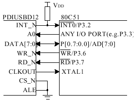 PDIUSBD1与80C51的连接电路如 图 3 所示。在这个例子中, ALE始终接低电平,说明采用单独地址和数据总线配置。A0 脚接80C51的任何I/O引脚,控制是命令还是数据输入到PDIUSBD12 。80C51的P0口直接与PDIUSBD12的数据总线相连接,CLKOUT 时钟输出为80C51提供时钟输入。