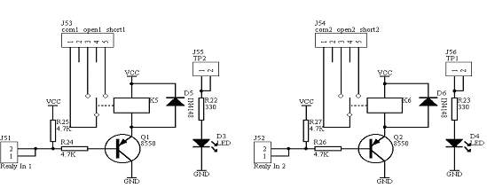 系统板上提供了2路继电器控制模块,分布在系统板的最左上端区域中,输入信号由Realy in 1和Realy in 2端口输入分别控制两路继电器,继电器控制的信号分别由最上端的两个插针输入和输出。分别称为“com1 open1 short1”,“com2 open2 short2”,由于这个两个继电器是单刀单掷控制,当继电器不吸合时,“com1”和“short1”相通,“com2”和“short2”相通;当继电器吸合时,“com1”和“open1”相通,“com2”和“open2”相通。其电路原理图1.1所示: