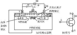 图2、N沟道(耗尽型)绝缘栅场效应管结构及符号