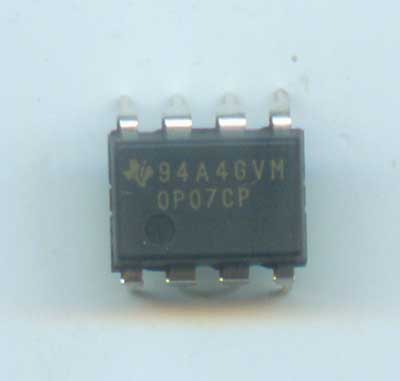 0P07,双列直插8脚。  OP07是高精度低失调电压的精密运放集成电路,用于微弱信号的放大。如果使用双电源,能达到最好的放大效果。