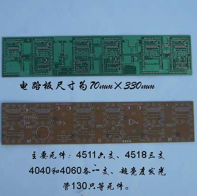 此电路板适合学生、电子爱好者学习装配,提高实际动手操作能力。(此板需要配石英晶体振荡器、4511六支、4518三支、4040和4060各一支、超亮度发光管130、53只电阻等元件。